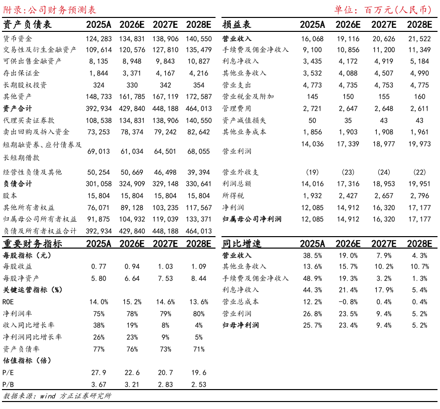 市场交投活跃驱动公司2025业绩稳健。1)从收入拆分来看,2025公司手续费及佣金净收入(经纪业务为主)、利息净收入(两融为主)、营业收入(基金代销、软件业务为主)分别为91.0、34.4、35.3亿元,同比+48.9%、+44.3%、+13.6%。2)单四季度看,公司经纪业务略承压,4Q25手续费及佣金净收入、利息净收入、营业收入分别为24.6、10.3、9.9亿元,同比-3.8%、+17.7%、+13.9%。