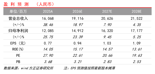 投资分析意见:维持“强烈推荐”评级,25年利润增速略低于预期主要受固收投资拖累,26年业绩仍然看好交投活跃度提升带来的经纪与两融利息收入增长。预计 26-28E 东方财富归母净利润分别为 149.1、163.2、171.8 亿元,同比+23%、+9%、+5%; 当前收盘价对应 26-28E动态PE 为 23 倍、21 倍、20 倍。