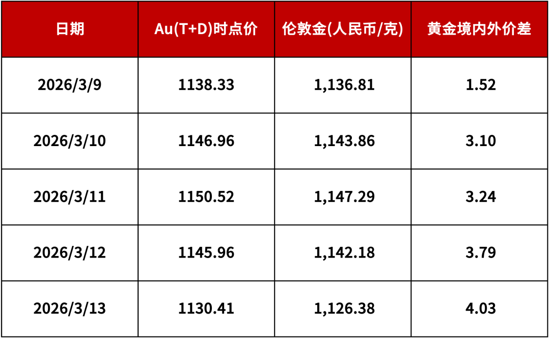 上周,黄金境内外价差震荡上行,最低触及1.52元/克,最高触及4.03元/克,收盘报4.03元/克,建议投资者审慎参与,重点关注逢高做窄交易机会。