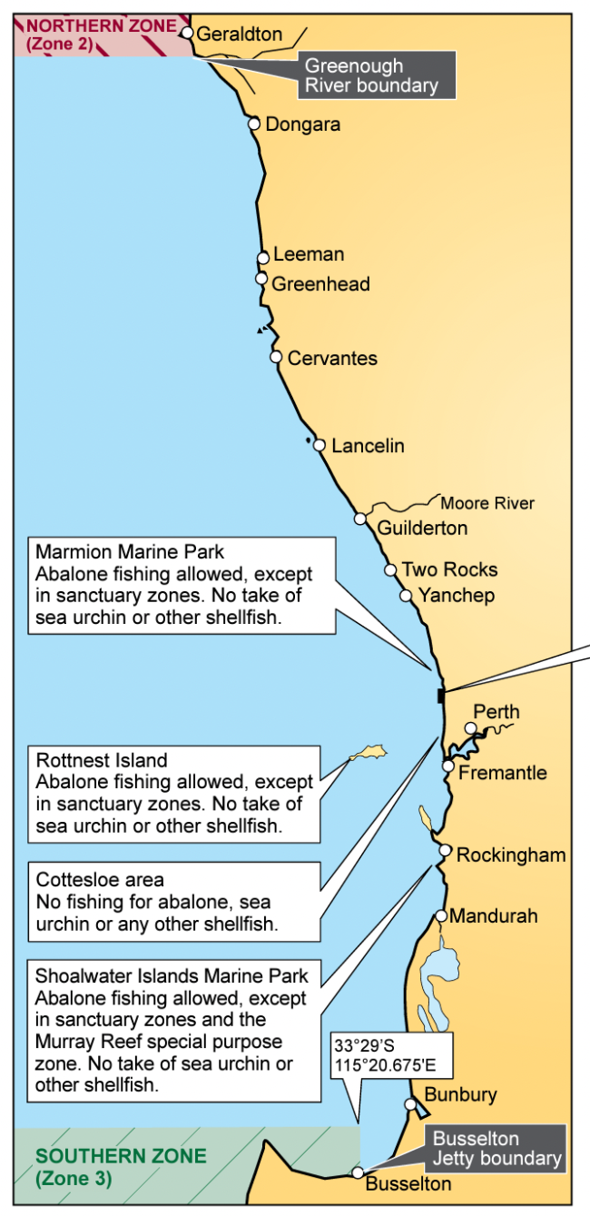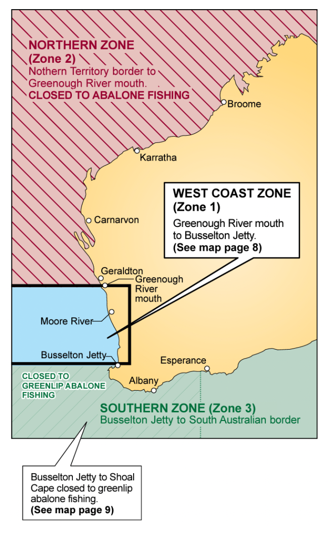 1.北区(2区)从格雷诺河口(Greenough River Mouth)到北领地边界的北区地带禁止捕捞鲍鱼,直到有通知为止。
