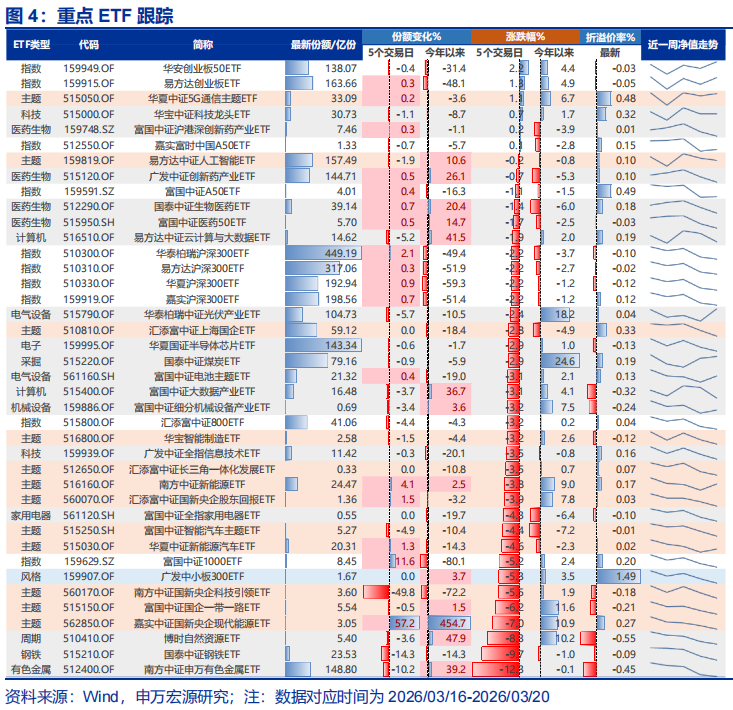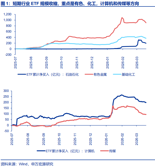 美伊冲突陷入僵局,各界对中东新秩序的准备均不足。但新平衡的形成,仍需要长时间的博弈。这体现为,短期事件性扰动仍在反复,资本市场风险偏好直接承压。短期市场推演美伊冲突影响,主要类比两次石油危机的经验:油价上涨,运费提升 → 通胀升温 → 货币紧缩 → 经济衰退,确认滞胀周期 → 股市基本面和估值共振回落。这样的逻辑链条,短期无法证伪。同时,我们关注,支持“第一阶段上涨”的资金短期出现了集中退坡:1. 行业ETF规模收缩,重点是有色、化工,计算机、传媒等方向。