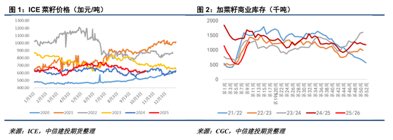 节日期间受美加会晤以及CBOT大豆扰动影响,ICE菜籽有所波动,但整体来看仍处于偏弱运行态势。目前加菜籽基本收获结束,而25/26年度累计出口仅79.6万吨,同比下降近60%,卖压隐现。虽然受结转库存偏低影响,目前加菜籽商业库存仍同比偏低,但环比上涨程度迅猛。总的来说,在加菜籽自身增产、缺失中国市场的背景下,预计ICE菜籽仍将维持弱势,主力合约600加元/吨的整数关口较难守住。
