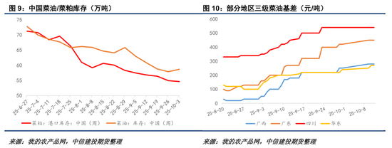 考虑到俄菜籽、澳菜籽陆续收获上市,后期中国菜系进口在边际上有恢复的可能,其中俄菜油、菜粕到港将早于澳菜籽。由于目前俄菜油维持160万吨以上的出口潜力,后期中国菜油进口数量恢复可能性较高,菜油未必还能持续去库。目前来看,中国菜油供应的主要矛盾仍是空间上的不均衡,华东地区较为集中,而西南地区流动性偏紧,导致全国三级菜油基差维持相对坚挺。