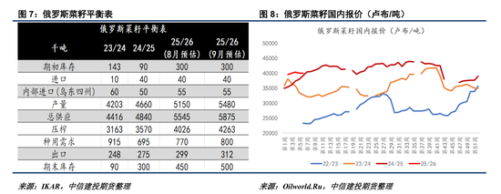 近期俄罗斯连续下调葵籽单产预估,IKAR将25/26年度葵籽产量预估下调至1792万吨,但菜籽方面截然相反,继续维持增产态势。最近几个月,IKAR连续上调25/26年度俄菜籽产量预估,从490万吨先后上调至500、515和548万吨。同时,25/26年度俄菜油/菜粕出口潜力调整到163.2和93.7万吨。不过,近期俄菜油对华报价依然保持坚挺,税前价格在8690-8700元/吨,税后成本在10400元/吨左右。
