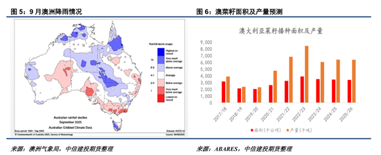 不过,9月期间澳大利亚整体降雨偏少,部分产区出现干旱。澳洲气象局数据显示,9月期间维多利亚州和南澳州降雨量低于历史均值的44%和45%,此外西澳州中东部、新南威尔士州东海岸地区降雨也低于正常水平。由于降雨偏少,澳菜籽单产表现可能不如前期预估,但仍有较大概率实现610-620万吨左右的产量水平,具备潜在出口潜力。后期仍需关注中国澳菜籽进口配额资质审核以及沿海菜籽压榨厂条线是否出现调整。