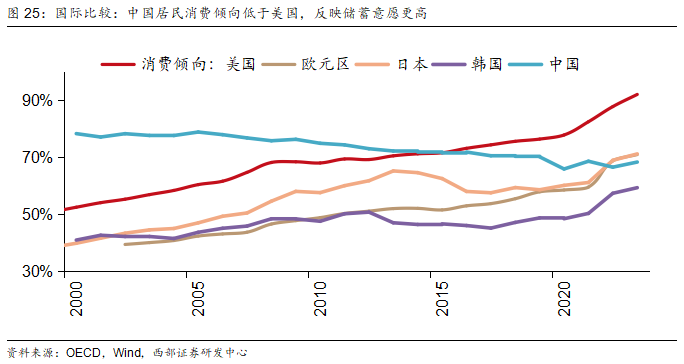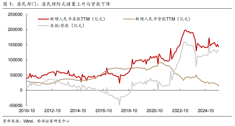 中国经济的内外部失衡是长期结构性矛盾。亚洲经济体普遍消费率低于投资率,从国际经验来看,中国当前消费率提升与经济实力和转型阶段并不匹配。我们在2025年中期策略指出“从实现再平衡、再通胀的角度来看,仅靠投资增长放缓或者单边供给收缩是难以实现再通胀的,反内卷与扩内需需要协同并进。”2021年以来,受地产调控政策,叠加经济预期趋弱影响,居民贷款的明显回落;另外一方面家庭部门预防性储蓄上升,消费能力在但支出受抑。