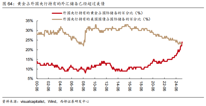 商品或呈现避险周期互相轮动。回顾2025年,黄金的上涨主要受到三方面的推动,即“货币政策宽松和滞胀摇摆”、“地缘政治和全球贸易秩序变动”、“高利率带来的公共债务攀升”。数据显示,截至2025年6月,外国央行持有的黄金占国际储备的比重为24%,已经超过了外国央行持有美债占国际储备的23%,这种动态反映了黄金作为储备资产的吸引力不断增强,而美元的主导地位相对减弱。往后看,这三因子中的第一因子的警报解除需要明显看到美国经济下行需求放缓带来的价格下行,反之任何供给端的冲击、美联储独立性的偏离都有可能进一步削弱对美国金融体系和美元的信用。第二因子或从外政逐步转变为内政不确定。第三因子代表的债务风险通常积重难返,或继续主导谨慎情绪。