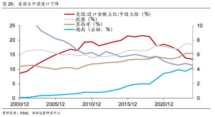 逆全球化对我国出口和全球供应链重构产生深远影响。尽管美国自中国进口占比近年来下降,自欧盟、墨西哥和越南的进口占比回升,中国对东盟、中亚、非洲等地区的出口和对外投资均出现明显增长,反映出我国对外投资建设的结构性变化。2024年我国对外直接投资中东盟占比达到17%以上,较前一年环比上行3.7个百分点。