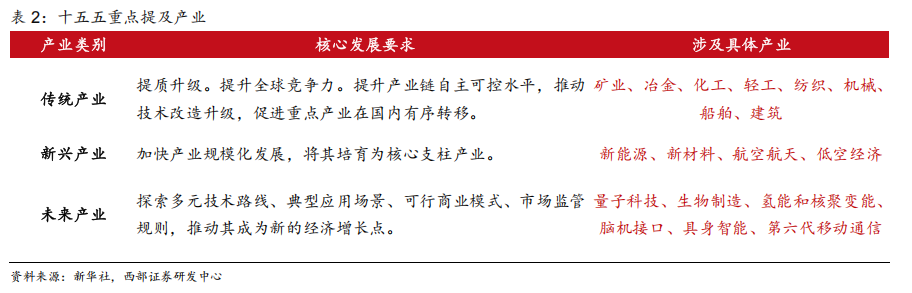 从产业任务来看,“十五五”规划预计以“新质生产力”为核心,构建以“先进制造业为骨干”的现代化产业体系,产业布局呈现出“传统产业—新兴产业—未来产业”的三梯队格局。在目标方面,也重点强调了要“加快建设制造强国、质量强国、航天强国、交通强国、网络强国”。