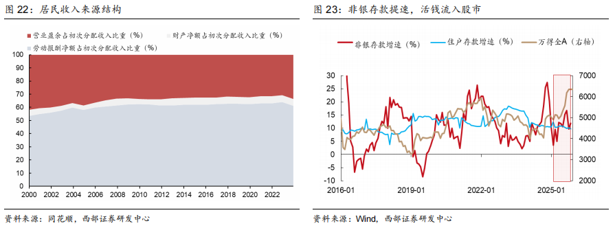 居民收入分为工薪收入和财产性收入。一方面,居民收入增长的源头在于企业,根本出路在于激发企业活力,并通过全面的产业升级提升全要素生产率;另一方面,地产对居民财富效应的支撑消退,提高居民在资本市场的资本配置、增加居民财产性收入的空间相对较大,股市有望成为新的财富蓄水池。