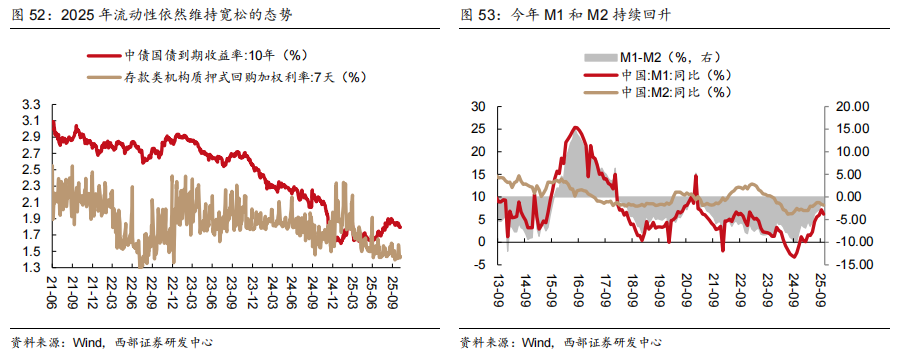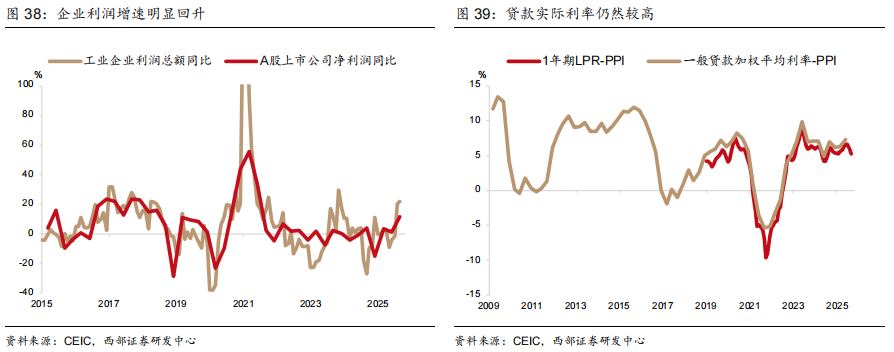 企业盈利改善,但是实际利率仍然偏高。2025年3季度工业企业利润增速明显加快,A股上市公司利润也明显改善。2024年3季度企业利润基数偏低,对2025年3季度同比增速回升有一定贡献;但是2025年3季度以来PPI环比企稳,也给企业盈利带来积极影响影响。目前按照PPI同比增速计算,企业实际利率仍然偏高。