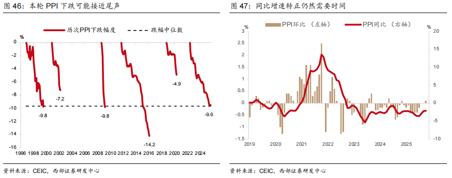 PPI出现企稳迹象。本轮PPI下跌周期经历了39个月,累计下跌9.6%,跌幅接近历史中位数水平,下跌时长仅次于2011-2016年的PPI下跌周期。2025年7月1日中央财经委员会第六次会议提出“纵深推进全国统一大市场建设,要聚焦重点难点,依法依规治理企业低价无序竞争,引导企业提升产品品质,推动落后产能有序退出”。部分行业开始实行“反内卷”措施。过去几个月PPI环比有所企稳。截至10月,PPI环比回升0.1个百分点,同比跌幅收窄至2.1%。