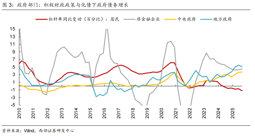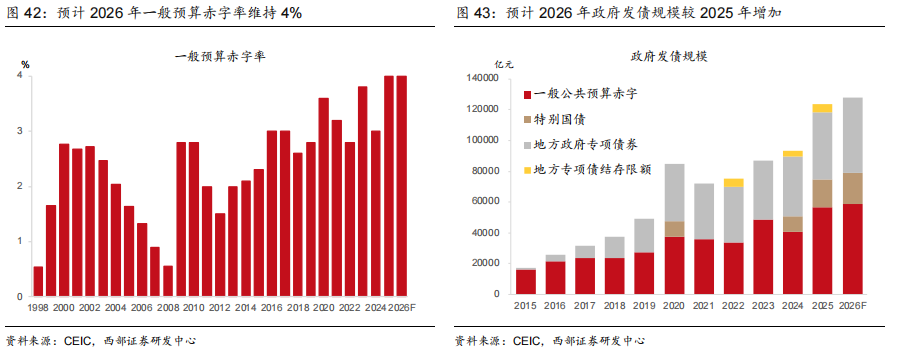 预计2026年赤字率持平,政府融资适当增长。我们预计,2026年继续实施积极的财政政策;一般预算赤字率维持4%不变;包括一般公共预算赤字、特别国债、新增地方政府专项债券在内的新增政府债券融资规模可能提高至12.8万亿元左右,相对GDP比例可能基本保持平稳。