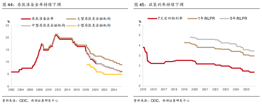 2026年央行可能降准降息,但下调幅度可能不大。2025年以来,央行各降息降准一次,7天逆回购下调0.1个百分点,存款准备金率下调0.5个百分点。我们预计,2026年可能降准降息一次左右,7天逆回购操作利率可能下调0.1个百分点,存款准备金率可能下调0.25个百分点。近期央行重启国债购买,将有助于维持长端利率稳定。