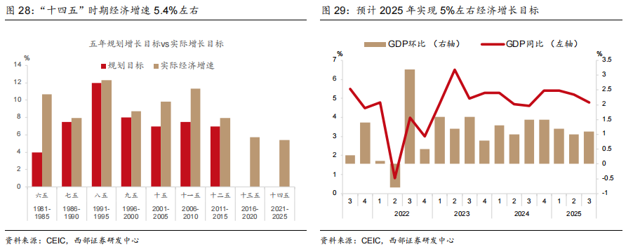 “十五五”时期要求经济增长保持合理区间。“十五五”时期在基本实现社会主义现代化进程中具有承前启后的重要地位。2035年远景目标纲要提出,2035年实现人均国内生产总值达到中等发达国家水平。目前距离2035年还有两个五年,考虑人口总量减少和老龄化率上升给潜在增长率带来长期下行压力,“十六五”时期将比“十五五”时期面临更大经济下行压力。最新发布的“十五五”规划建议要求“十五五”时期经济增长保持在合理区间。“十四五”前四年GDP平均增速5.5%,2025年有望实现5%左右的增速,我们预计“十四五”时期将实现5.4%左右的GDP平均增速。“十五五”规划不公布具体的经济增速目标。我们预计,“十五五”期间年度经济增长目标可能维持5%左右。