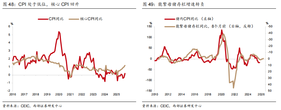 CPI增速可能转正。截至2025年10月份,CPI同比增长0.3%。CPI同比增速仍然受食品和能源价格下跌拖累;核心CPI同比增长1.2%,增速较2024年低点明显回升。2025年猪肉价格下跌给食品和CPI造成拖累,供求两方面因素都有影响。9月份能繁母猪增速再次转负,2026年生猪供求不平衡状况可能得到改善。我们预计2026年CPI增长0.4%左右,较2025年零增长回升。