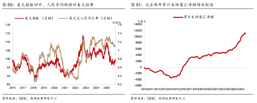 人民币汇率可能延续升值趋势。2025年以来,美元总体走弱,人民币对美元保持强势。过去几年,人民币实际有效汇率贬值幅度较大,人民币汇率本身存在低估。但是中国经常账户持续增长,给人民币汇率带来基本面支持。我们预计,未来几年美元面临贬值压力,有利于人民币升值;中美贸易摩擦缓和也有利于人民币汇率升值。过去两年,涉外外汇收付款却没有进行结售汇的净金额增长较快,如果这部分资金开始结售汇,可能加速人民币升值。我们预计,2026年底人民币汇率可能升至6.9元/美元左右。