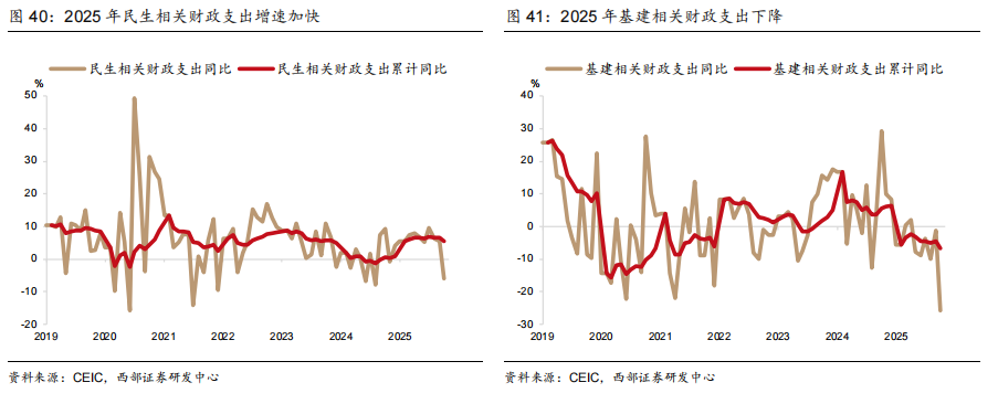 2025年财政对投资支持力度偏弱,但4季度稳投资政策力度加大。2025年财政对民生和消费支出力度加大,但是财政资金对投资支持力度支持减弱,1-10月基建相关财政支出累计同比下降6.6%,给基建投资造成拖累。10月31日,发改委在发布会[2]上表示,近期5000亿元新型政策性金融工具资金已全部投放完毕,项目总投资约7万亿元,共支持2300多个项目,重点投向数字经济、人工智能、消费基础设施,以及交通、能源、地下管网建设改造等城市更新领域。此外,还安排5000亿元地方政府债务结存限额,用于补充地方政府综合财力和扩大有效投资。其中新增2000亿元专项债券额度,专门用于支持部分省份投资建设。