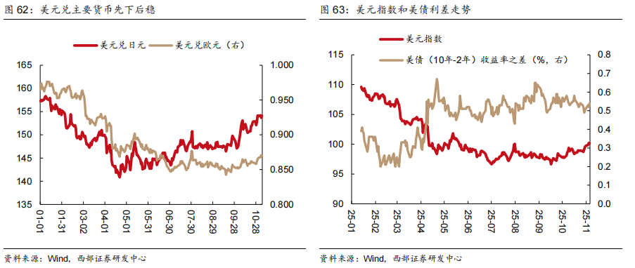 美元指数预计在2026年并不弱。回顾2025年,美元指数震荡回落后区间内震荡。2025年上半年美元指数的回落主要受到关税、大而美法案对经济前景的不确定。另外,非农走弱也在导致市场对美联储重启预防式降息定价。但是下半年,美元指数在降息周期开启后,即使在非农走弱下也保持区间内震荡,下行的趋势被打断,背后不仅是美国整体内部经济增速依然领先于主要国家,也存在外部因素,比如随着日本新首相上台,市场对其货币政策的状态转略鸽。往后看,预计美元指数在2026年或保持区间内波动。Fedwatch显示市场预期2025年美联储降息2次,而欧央行似乎接近暂停降息,这使得欧美利差对美元存在一定的抑制。但改变预期的因子仍存,无论是欧美通胀的分化进一步拉大(对应美国通胀粘性增加、欧元区通胀下行风险增加),亦或是非美国家的地缘政治不确定性都或对美元形成阶段性支撑。