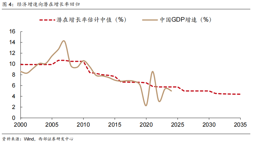 尽管GDP增长指标符合预期,但中国经济修复式增长不是典型的复苏态势。这体现在经济增速向潜在增长率回归,但实际产出仍低于潜在产出,通胀没有压力。传统引擎(房地产、基建)拉力减弱,新动能(新质生产力、科技、新能源等)尚未完全补位,导致增速阶段性低于潜在水平。