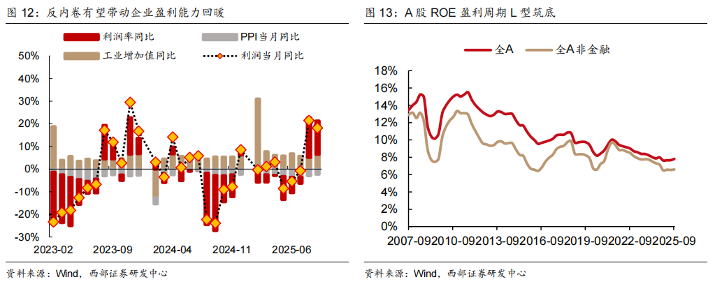 2025年宏观叙事上很大的变化在于政策导向对经济再平衡的重视程度上升,包括“反内卷”、“两新两重”和培育新场景等。本轮产能过剩多了很多中下游制造行业,涉及更多民营企业,导致“反内卷”的进程将更为温和长期。我国当前企业盈利周期呈现L型探底,2025年8-9月利润率出现回升迹象。结合A股上市公司数据来看,全A和全A非金融板块Q3 ROETTM为7.81%和6.59%,较2024年末提升0.19BP/0.1BP,呈现出盈利筑底但向上动能不足的态势。