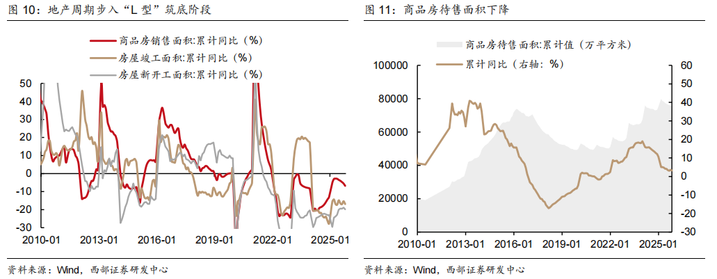 房地产从“金融属性”向“居住属性”回归,市场进入“L型”筑底阶段。今年1-10月全国房地产开发投资同比下降14.7%,新开工面积下降19.8%,供给端持续收缩;销售面积同比降幅收窄至6.8%,伴随待售面积下降,显示地产正在库存去化进程。2024年926政治局会议后的一揽子政策出台后,行业有筑底迹象但修复节奏偏慢,今年政策重心转向“房地产新发展模式”(如保障性住房收购、城市更新)。