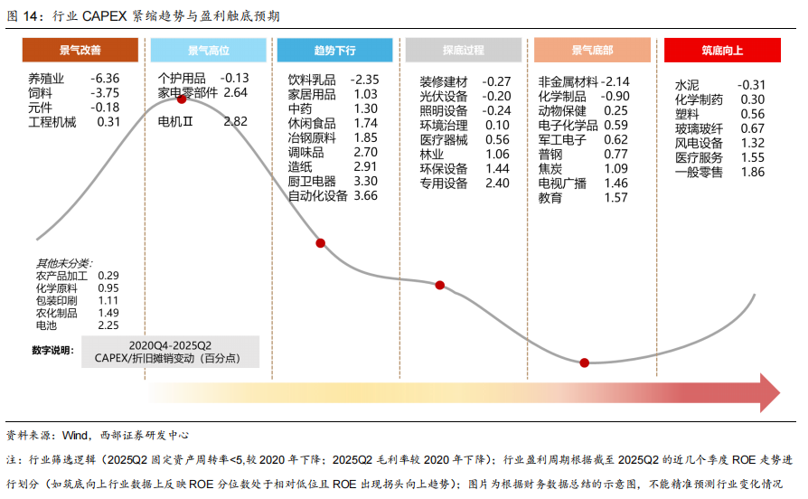 1)农林牧渔相关的养殖业、饲料、农化制品,更多来自困境反转;2)顺周期板块中的普钢、水泥、塑料、玻璃玻纤和工程机械。此外,我们也观察到偏高端制造的元件、电池、风电、电机和专用设备,以及医疗服务行业也出现了ROE的改善。相比之下,部分消费相关(休闲食品、厨卫、装修建材、造纸等)、光伏设备等行业景气与固定资产周转率仍在下滑或者探底过程中。