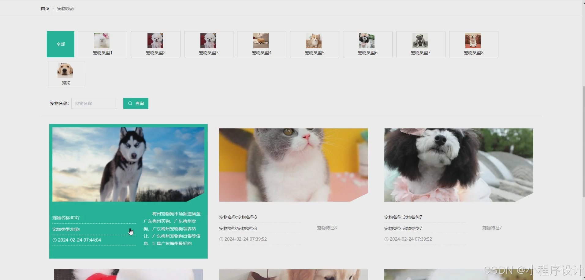 宠物浏览:浏览可领养宠物的信息,包括照片、品种、年龄、性别等。