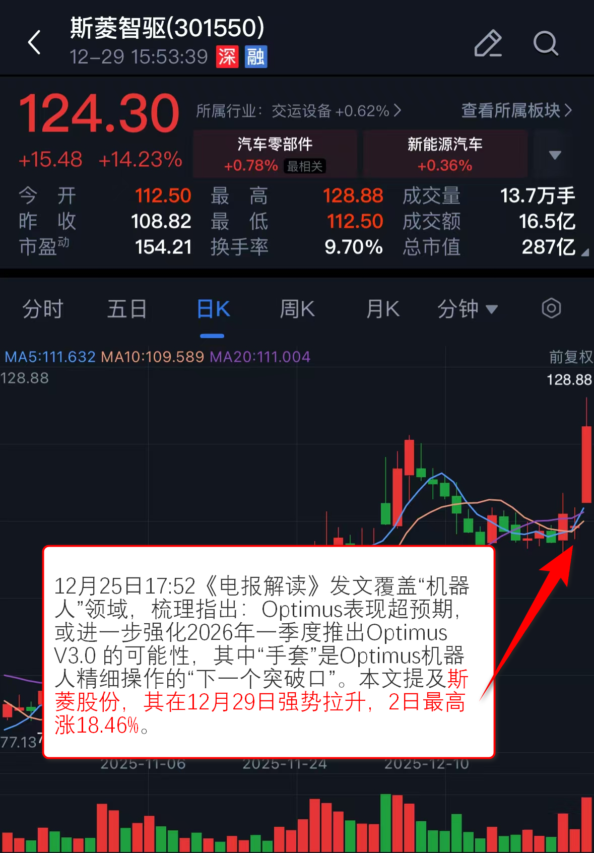 12月25日17:52《电报解读》发文覆盖“机器人”领域,梳理指出:Optimus表现超预期,或进一步强化2026年一季度推出Optimus V3.0 的可能性,其中“手套”是Optimus机器人精细操作的“下一个突破口”。本文提及斯菱股份,其在12月29日强势拉升,2日最高涨18.46%。