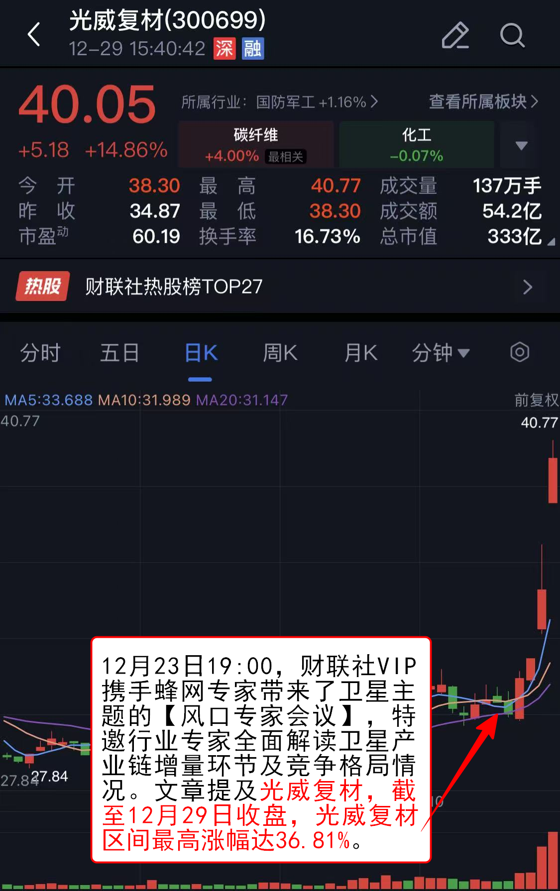 12月23日19:00,财联社VIP携手蜂网专家带来了卫星主题的【风口专家会议】,特邀行业专家全面解读卫星产业链增量环节及竞争格局情况。文章提及光威复材,截至12月29日收盘,光威复材区间最高涨幅达36.81%。