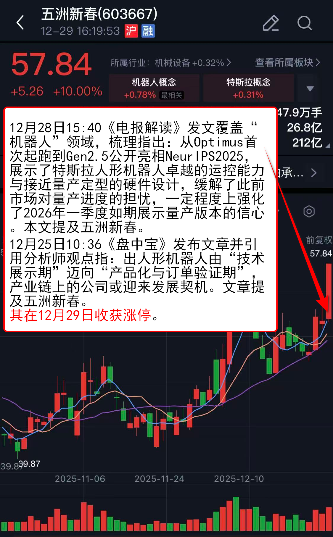 12月25日10:36《盘中宝》发布文章并引用分析师观点指:出人形机器人由“技术展示期”迈向“产品化与订单验证期”,产业链上的公司或迎来发展契机。文章提及五洲新春。
