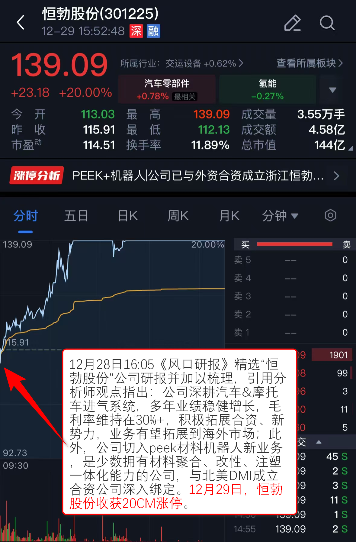12月28日16:05《风口研报》精选“恒勃股份”公司研报并加以梳理,引用分析师观点指出:公司深耕汽车&摩托车进气系统,多年业绩稳健增长,毛利率维持在30%+,积极拓展合资、新势力,业务有望拓展到海外市场;此外,公司切入peek材料机器人新业务,是少数拥有材料聚合、改性、注塑一体化能力的公司,与北美DMI成立合资公司深入绑定。12月29日,恒勃股份收获20CM涨停。