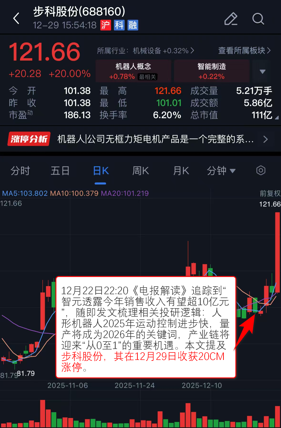 12月22日22:20《电报解读》追踪到“智元透露今年销售收入有望超10亿元”,随即发文梳理相关投研逻辑:人形机器人2025年运动控制进步快,量产将成为2026年的关键词,产业链将迎来“从0至1”的重要机遇。本文提及步科股份,其在12月29日收获20CM涨停。