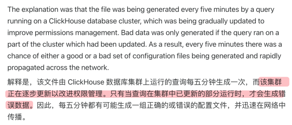 于是 14:24,他们赶紧停止自动生成新配置文件,手动翻出一个之前能正常工作的旧版本,测试确认没问题,然后推送到全球所有服务器,大部分服务开始恢复。