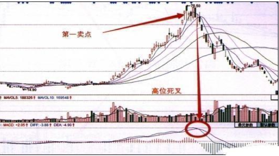 其含义是指股价在经过大幅拉升后出现横盘,从而形成的一个相对高点,投资者尤其是资金量较大的投资者,必须在第一卖点出货,或减仓。判断第一卖点成立的技巧是股价横盘、MACD死叉卖出,如下图所示。