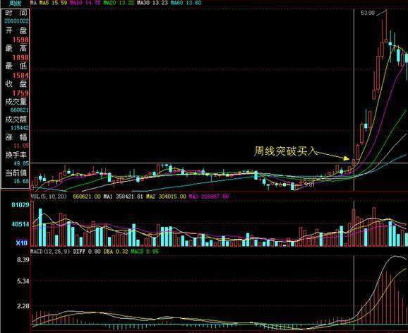 在什么时候,什么位置买入股票能够快速获利?股票在什么时候,什么位置上涨的力度最大,上涨是时间最长?通过多年的实盘和比较,分析和总结发现:一个股票真 正的快速,持续上涨的时机与空间位置是在周线突破长期(时间周期可以定为3-12个月份左右或更长一些)的震荡或盘整的高点或者强势突破周线生命线以后。此时无论是短线还是中线都是最安全而且最容易赚钱的买入时机。所以周线突破应该才是中线与短线的最安全买点。接下来我就以自己多年的实盘经验给大家详细讲 解如何利用周线把握买入点,获取最大利润。