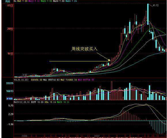 1、周线突破长期(时间周期可以定为3-12个月份左右或更长一些)的震荡或盘整的高点方可买入。
