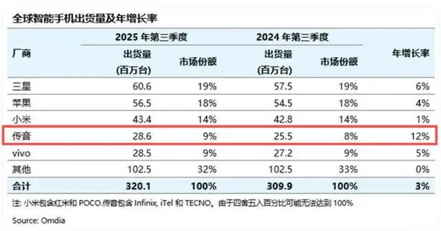 比如2025年三季度,传音就又回到了全球第四名,超过了OPPO、VIVO。