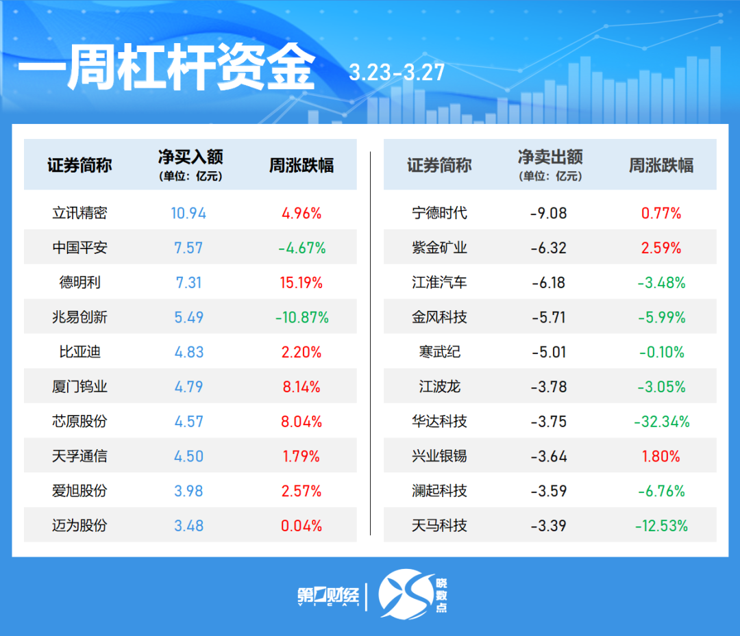 立讯精密本周获融资净买入居首,净买入额为10.94亿元,周涨4.96%。中国平安、德明利、兆易创新获净买入额居前;宁德时代、紫金矿业、江淮汽车遭净卖出额居前,金额分别为9.08亿元、6.32亿元、6.18亿元。