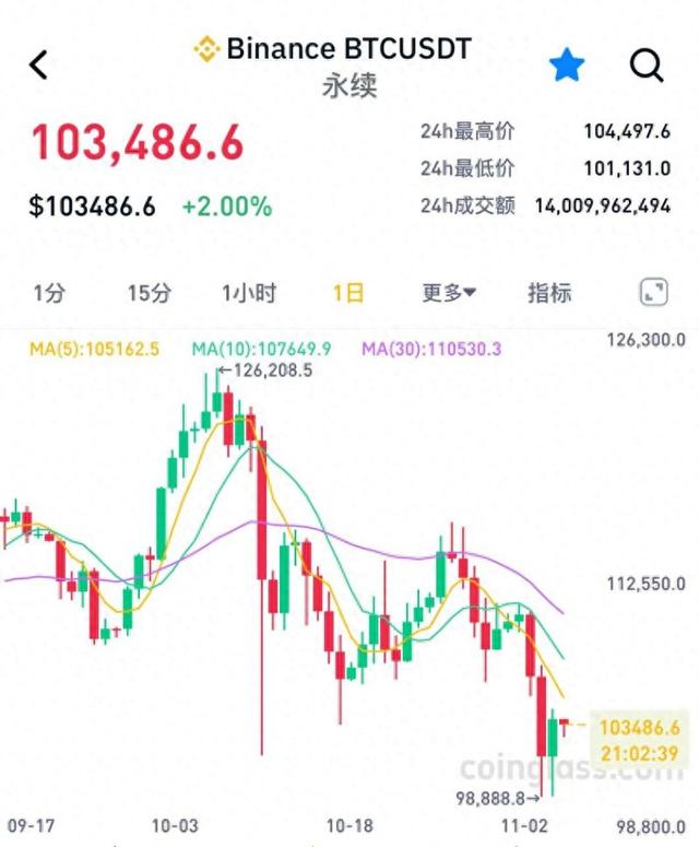 一个月之间,加密市场风云突变。比特币(BTC)曾在10月6日站上12.62万美元的历史新高,随后而来的便是“10·11”史上最大下跌清算事件。11月5日,比特币再度跳水,一度跌破10万美元重要支撑水平。截至发稿,比特币最新价格虽已回升至10万美元之上,现报103486.6美元,但较历史高点仍然下跌近20%。