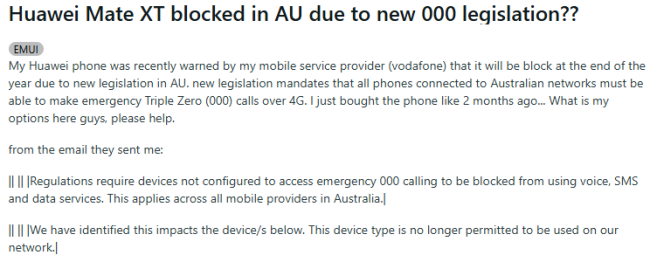 该网友引述了服务商邮件中的内容:“澳大利亚的新法规规定,所有连接到澳大利亚网络的手机必须能够通过4G网络拨打紧急三重零(000)电话。”