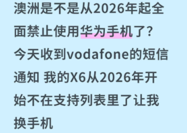 一位华人网友在社媒发帖,“澳洲是不是从2026年起全面禁止华为手机了?今天收到Vodafone的短信通知,我的X6从2026年开始不在支持列表里了,让我换手机。”