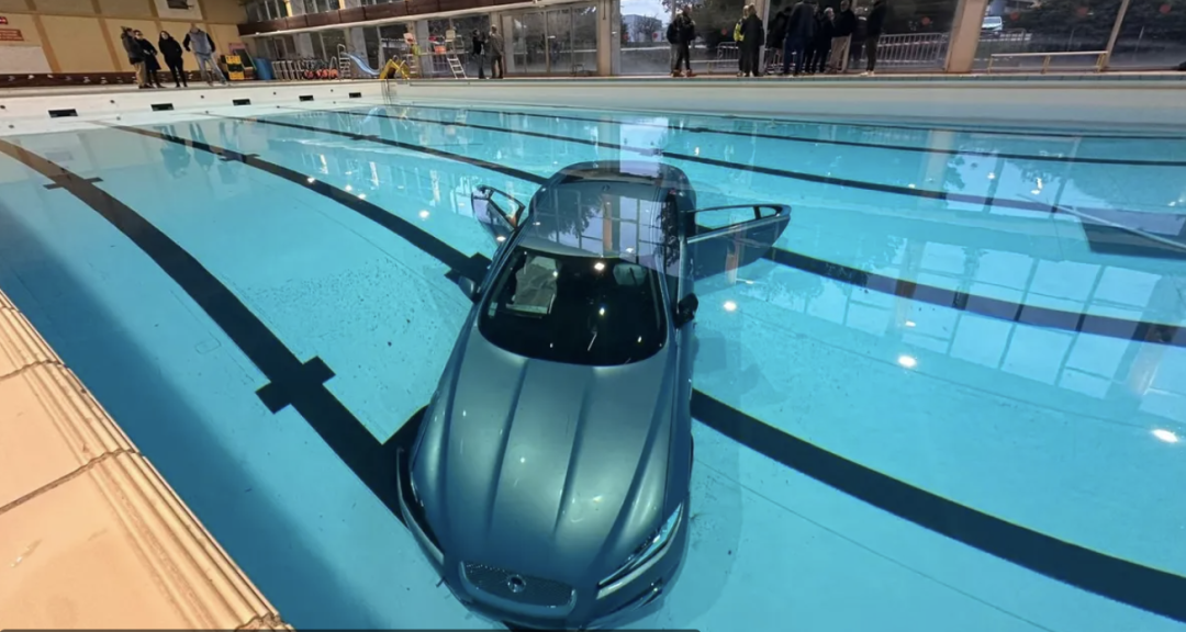 一辆近2吨重的捷豹XF,安安静静地躺在泳池底部,像一只不合时宜的钢铁鲸鱼。