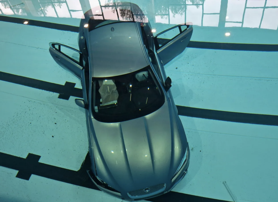 这辆捷豹XF从室外一路失控,穿过斜坡、擦过树木、避开立柱、直接撞穿泳池的整面玻璃幕墙,在空中完成了一次令人头皮发麻的“抛物线运动”,然后——