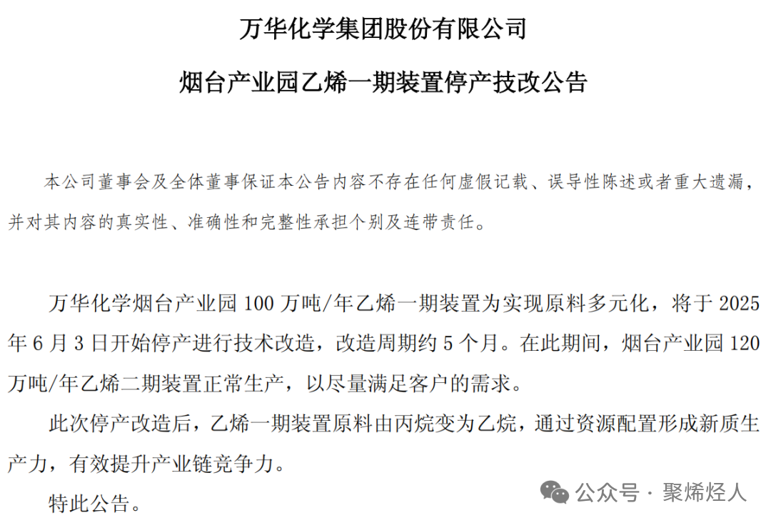 2025年5月23日,万华化学发布福建工业园停产检修公告以及烟台产业园乙烯一期装置停产技改公告。