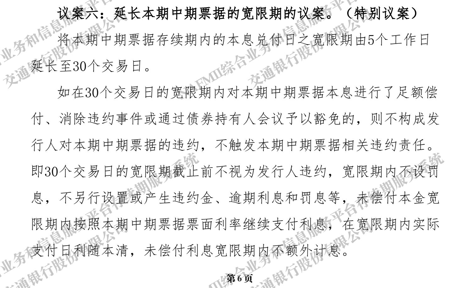 此外,议案六单独聚焦宽限期调整,提出将本息兑付宽限期由5个工作日延长至30个交易日,宽限期内不计罚息、违约金,未偿付本金仍按票面利率计息,旨在为债务处置预留更多缓冲空间。
