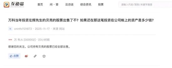 11月25日,万科企业股份有限公司通过深交所互动易平台回应投资者询问时确认,已全部出售所持有的贝壳找房股票。不过万科并未披露此次减持的具体细节,包括时间节点、减持节奏及收益情况。