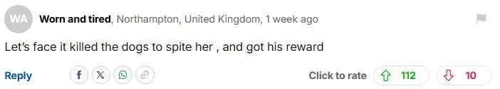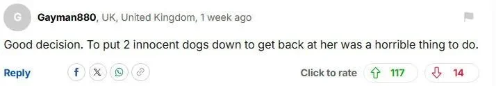 “明智的判罚。为了报复她而残忍地杀害两只无辜的狗狗,这种行为太可怕了。”