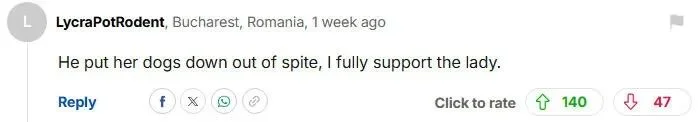 “他是出于报复才杀死了她的狗,我完全支持这位女士的行为。”