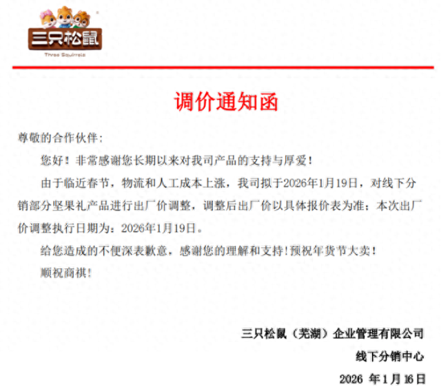 【环球网消费综合报道】春节年货消费旺季即将来临之际,休闲食品企业三只松鼠发布了调价通知,引发市场广泛关注。据悉,三只松鼠Mini店与分销事业部发布通知称,自1月19日起,将上调线下分销渠道部分坚果礼产品的出厂价。此次调价动作折射出当前休闲食品行业面临的成本压力,也表明三只松鼠深耕线下市场、优化渠道结构的战略意图。